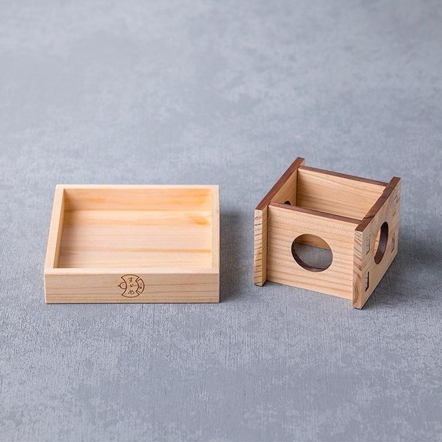 組み立て式の三方です。こちらは石川県産木材の利用を推進するルーティヴ株式会社さんとの共同開発商品。材料の能登ヒバは、能登半島に広く造林された石川県独自の木。ヒノキチオールという成分が多く含まれており、抗菌・殺菌効果や防臭・消臭効果があります。